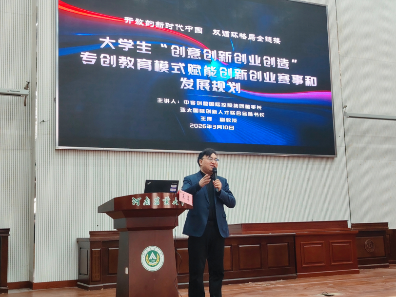 随后,王潭以“大学生‘创意创新创业创造’专创教育:赋能创新创业赛事和发展规划”为主题作专题分享。他深耕产教融合20余年,立足双循环格局解读专创融合逻辑,拆解创新创业实践路径,并针对中国国际大学生创新大赛开展备赛指导,同时对阿里国际站河南省首届大学生跨境电商创业实战大赛复赛备战要点进行深度解读,围绕项目落地性、跨境运营能力、商业逻辑完整性等评审要点细致分析,结合我校学科特色给出针对性备赛建议,帮助团队找准优势、突出亮点。