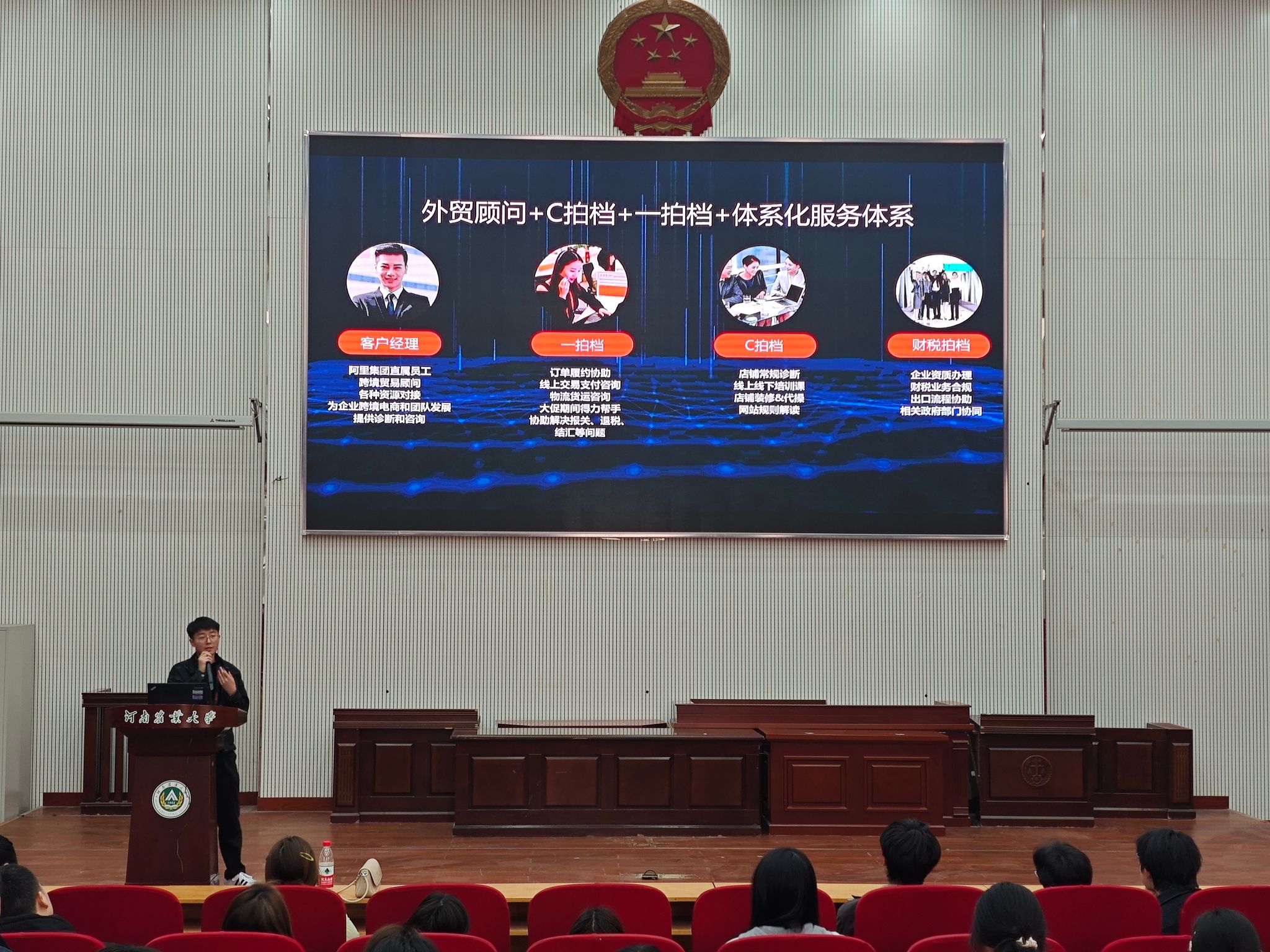 讲座伊始,阿里巴巴国际站企业嘉宾高康康围绕AI时代数字外贸创新创业展开分享,介绍了搭载先进AI模型的“生意助手2.0”,通过四大数字员工智能功能,展示了AI技术对外贸全流程的优化赋能,并结合实战案例为同学们提供了可落地的外贸创业思路。