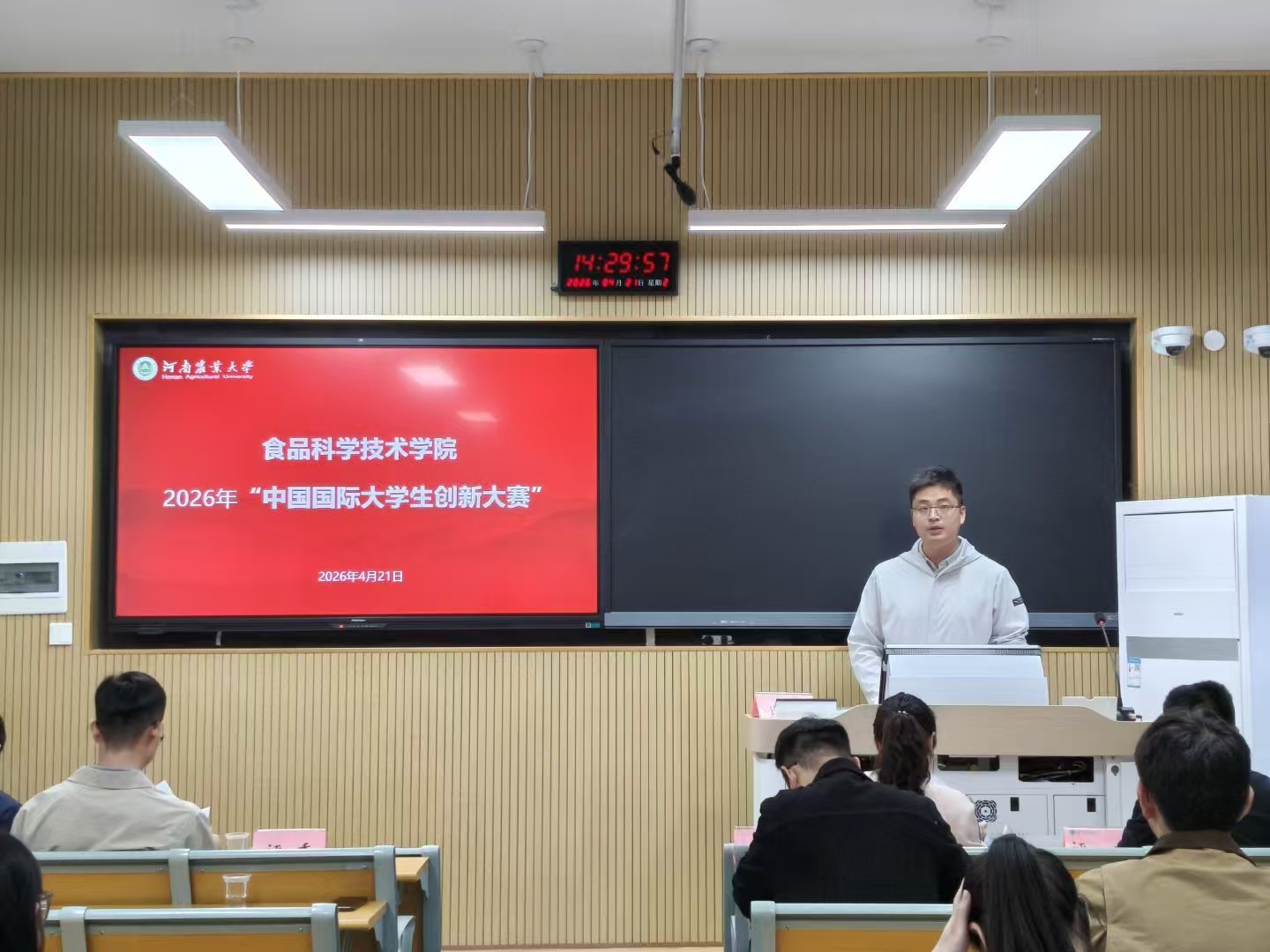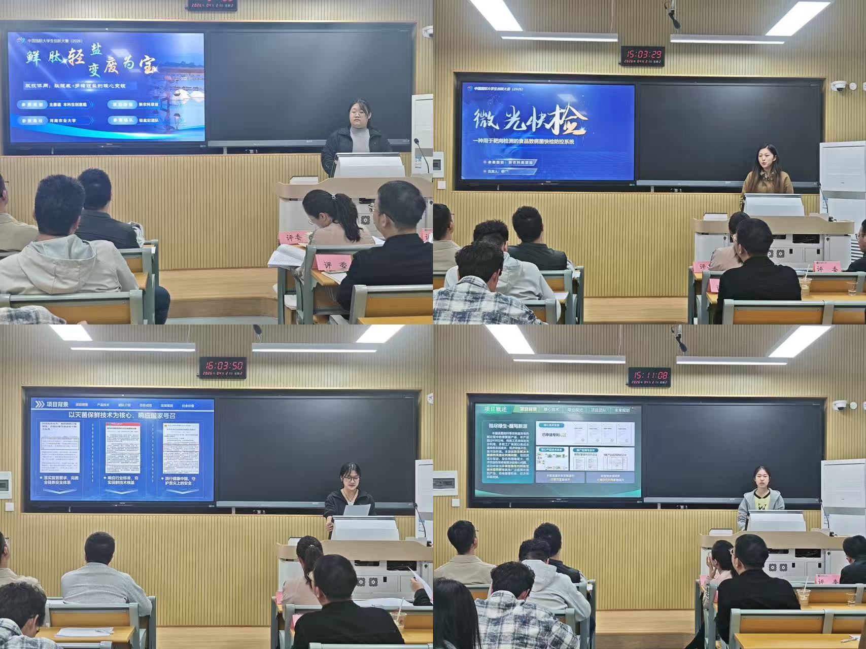 4月21日下午,食品科学技术学院在3号楼110教室举办2026年中国国际大学生创新大赛院内选拔赛。各系教师代表受邀担任指导嘉宾。本次比赛旨在为同学们搭建创新创业实践平台,鼓励大家将创新创意转化为实际项目成果,营造良好的校园创新氛围。